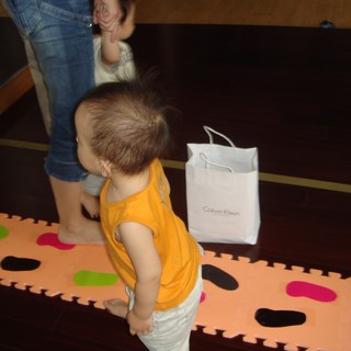 每個孩子都乖乖讓媽咪牽著走平衡直條及腳印。